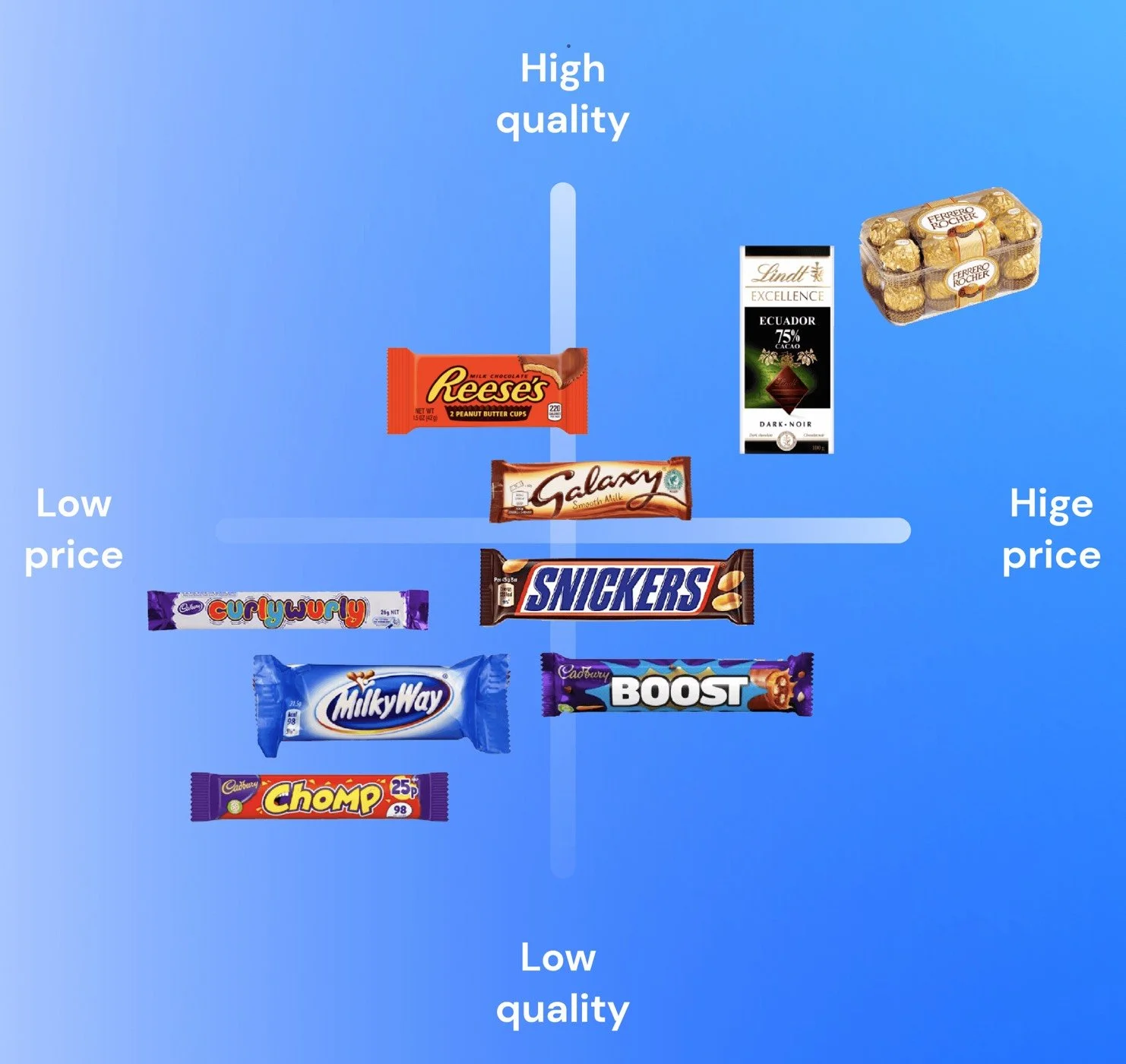 When you map your competitors visually, you start to see patterns that are impossible to spot in a spreadsheet. This is a competitive positioning map. In the pictures 1.1 & 1.2, each company is placed on a simple two-axis chart based on the factors that matter most in your market (price, quality, automation, speed, or whatever defines customer value). Each circle represents a competitor, its size reflects market strength (user base, revenue, or market share). This illustrates the competitive landscape as a whole. You can immediately see: who is closest to you, which segments are crowded, which competitor is strongest (biggest circle).