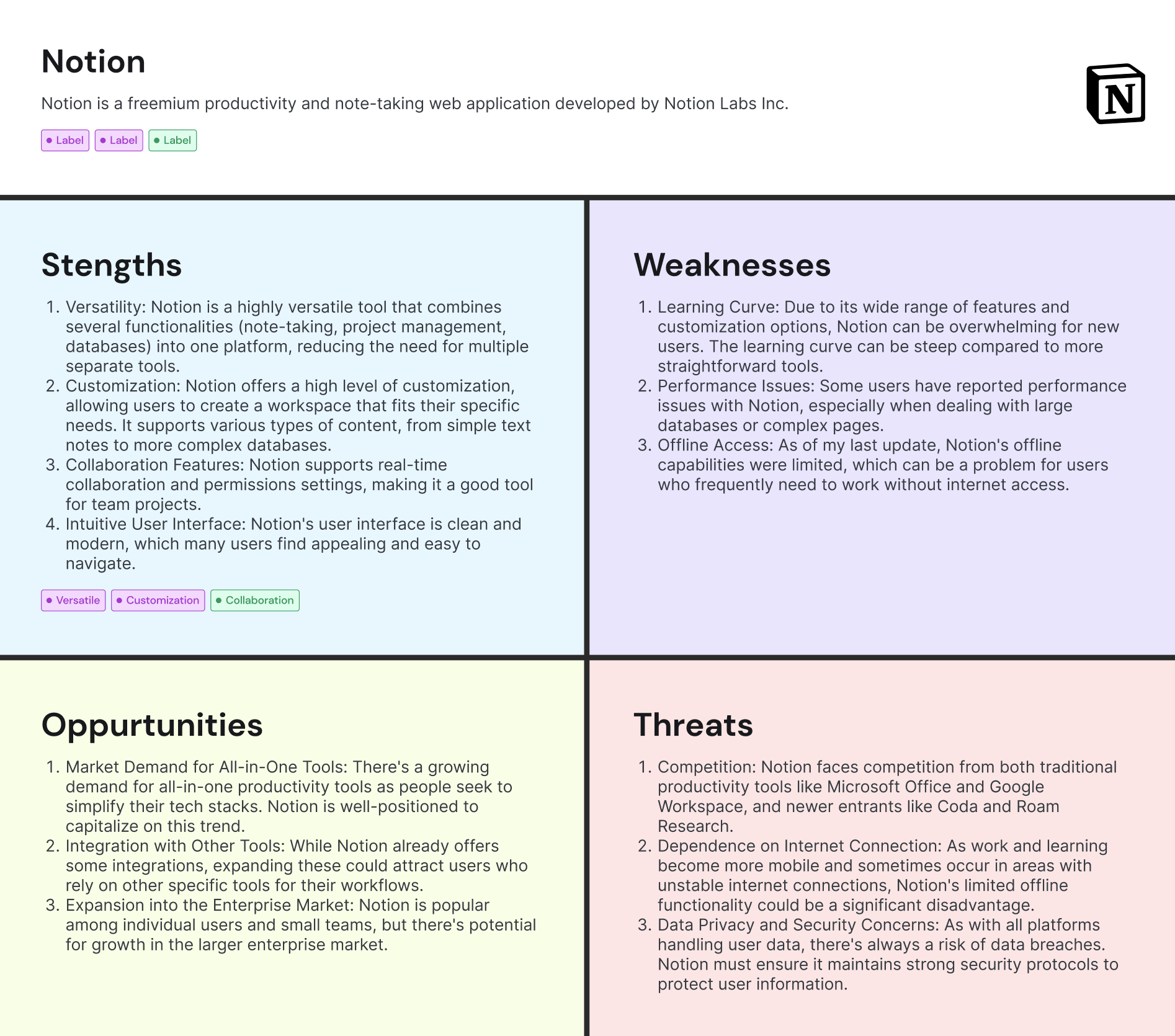 SWOT Analysis (Strengths, Weaknesses, Opportunities, Threats): A classic tool that can be applied to each competitor and yourself. For each competitor, summarize their internal Strengths and Weaknesses, and the external Opportunities and Threats they face. For example, a competitor’s strengths might be a strong brand and large user base, while weaknesses might be slow feature development. Opportunities could be a growing market or a new distribution channel, whereas threats might be new entrants or regulatory changes. Writing this out helps highlight where competitors are vulnerable and where they could expand. More importantly, it shows you where you have an opening. Perhaps a competitor’s weakness aligns with a strength of yours – that’s a point to exploit. Conversely, if a competitor has a big strength that you lack, you’ll need a plan to differentiate from it.