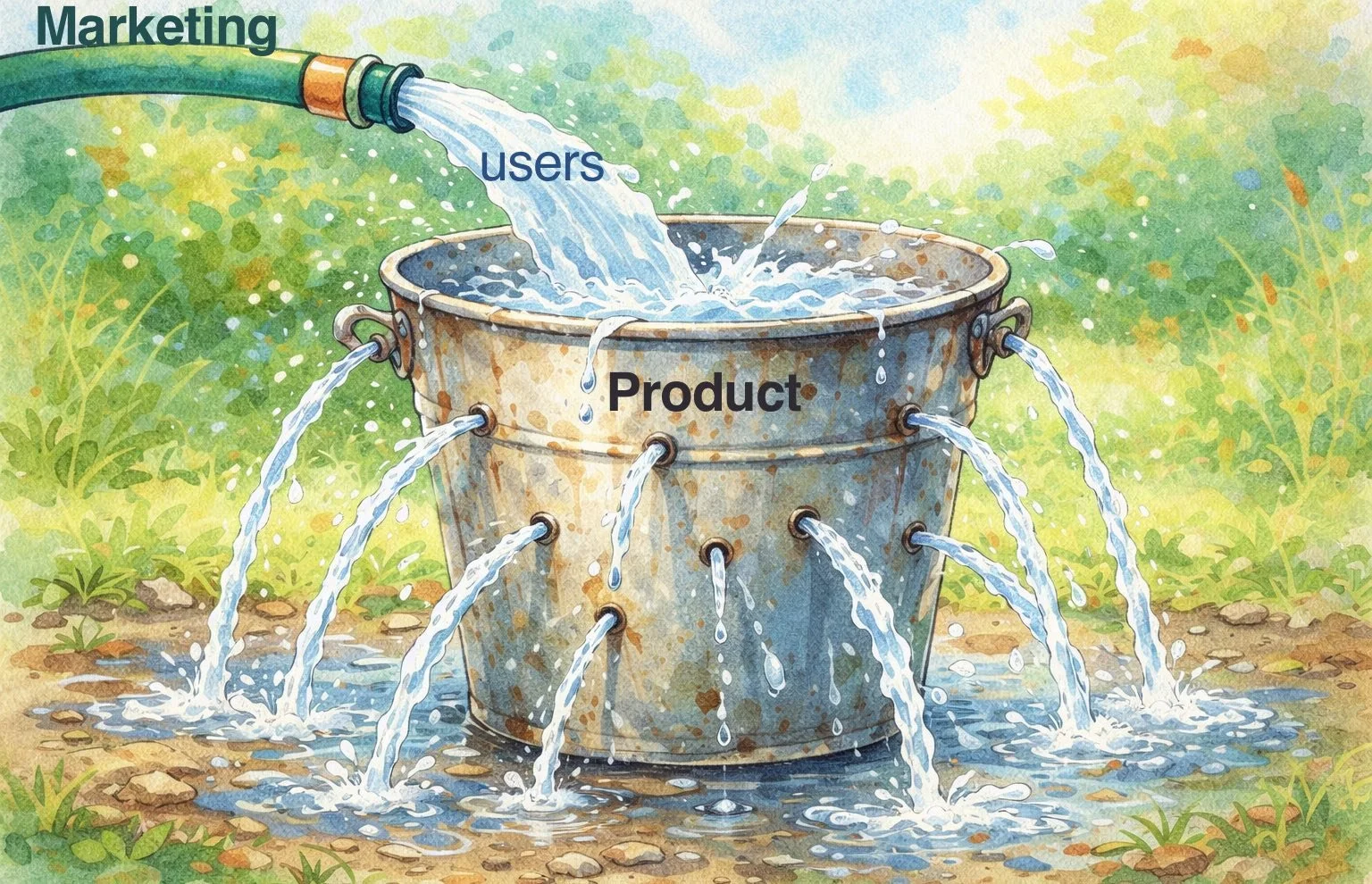 Every experienced founder and investor preaches the same gospel: nail product-market fit before you scale marketing. Product-market fit (PMF) means you’ve built something people want so badly that they naturally stick around and tell others. Until you reach that point, buying users with ads is at best inefficient and at worst lethal. There’s little point to aggressively marketing a product that brings no value to its users. People may come once out of curiosity, but they’ll quickly leave. All you’re doing is momentarily filling that leaky bucket, not fixing the holes.